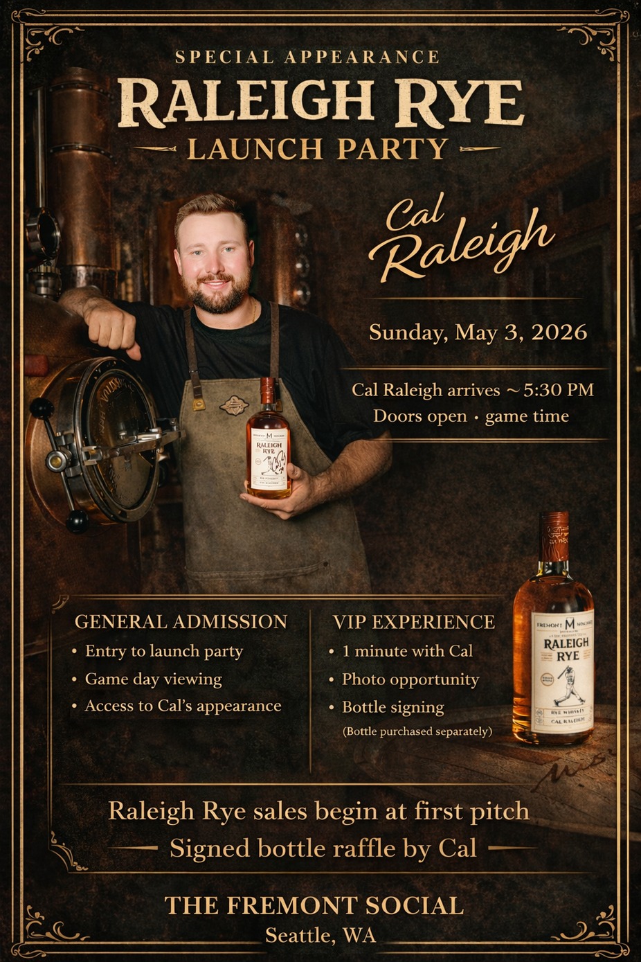Join us at The Fremont Social for the official launch celebration of Raleigh Rye, a limited-release whiskey crafted in partnership with Cal Raleigh.